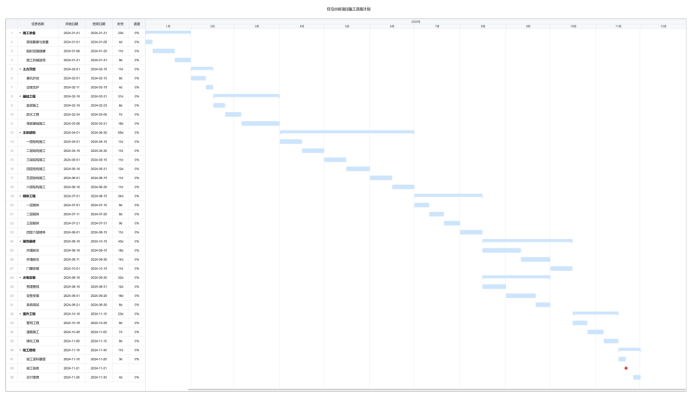 AI生成的甘特图任务层级分明、时间安排合理、关键工序依赖关系清晰,项目经理可以直接用于施工组织设计编制和进度管控。
