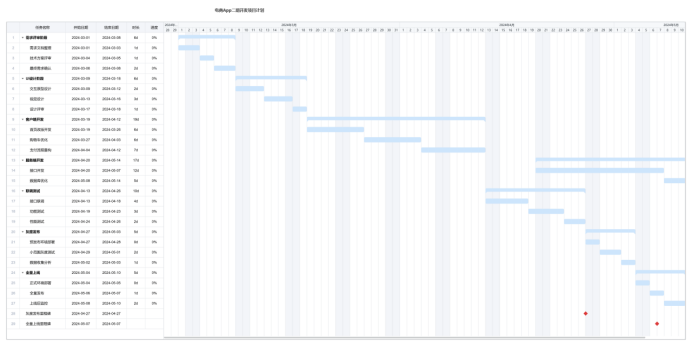 时间:横向展示任务的开始和结束日期,里程碑节点可以用特殊符号标记。