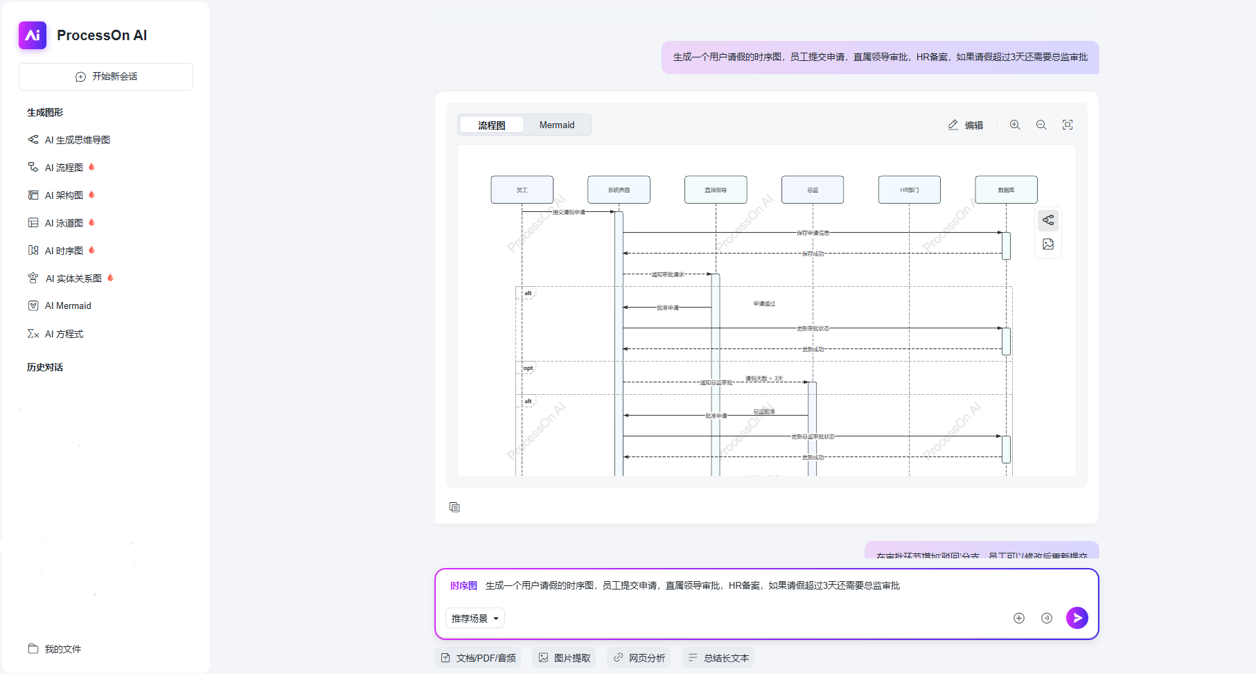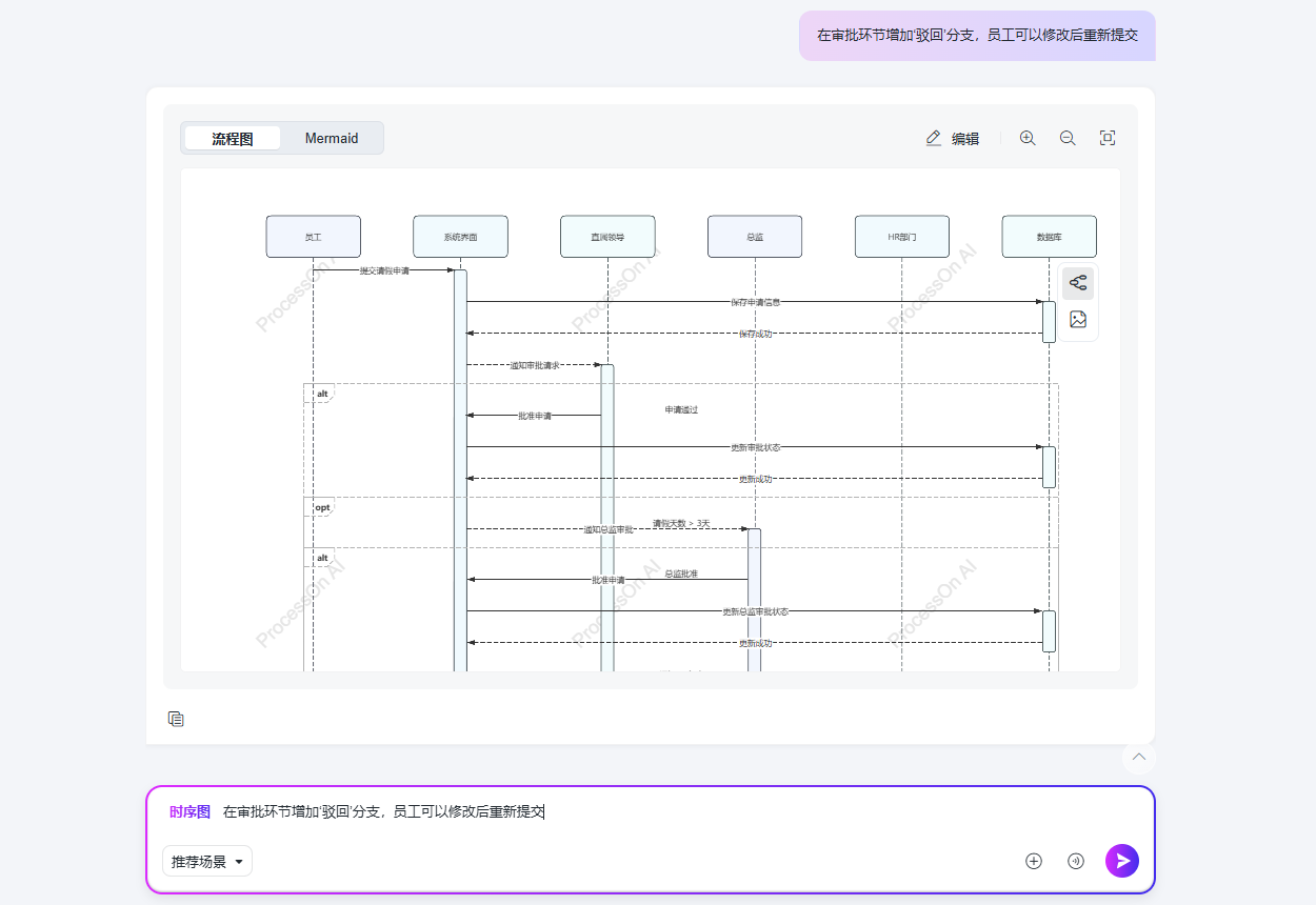 但现在不一样了。ProcessOn AI最近升级了时序图生成能力,直接输入需求,AI秒出专业级时序图,还能连续对话优化,彻底把画图这件事变成了“动嘴就行”。