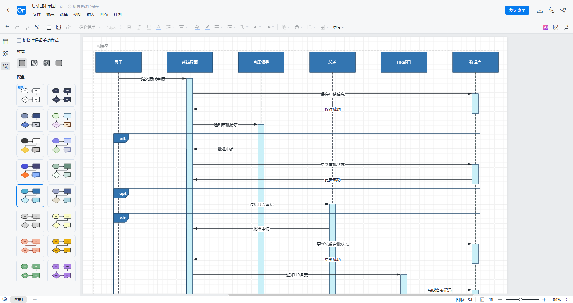 这张由AI生成的请假流程图时序图,业务逻辑严谨完整,无逻辑漏洞,比较贴合我们真实工作中的请假流程,既清晰展示了请假审批从发起到结束的全部交互顺序和分支逻辑,又严格遵循UML的绘制规范,语法专业准确,是一份可以直接落地的高质量交付物。