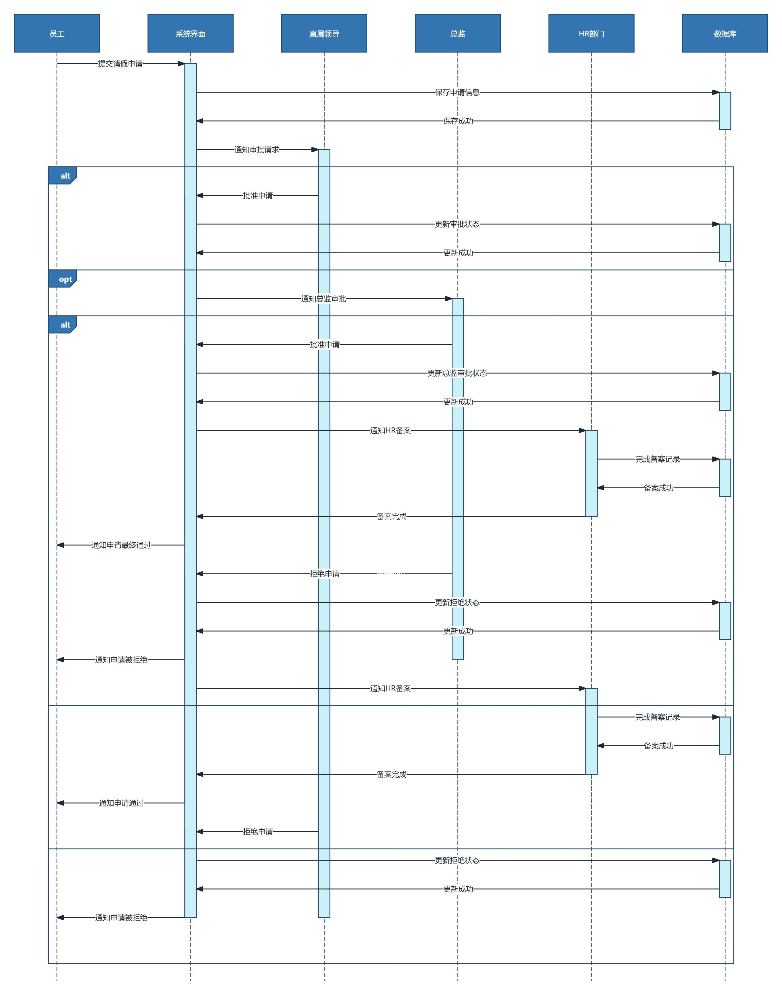 “生成一个用户请假的时序图,员工提交申请,直属领导审批,HR备案,如果请假超过3天还需要总监审批”。