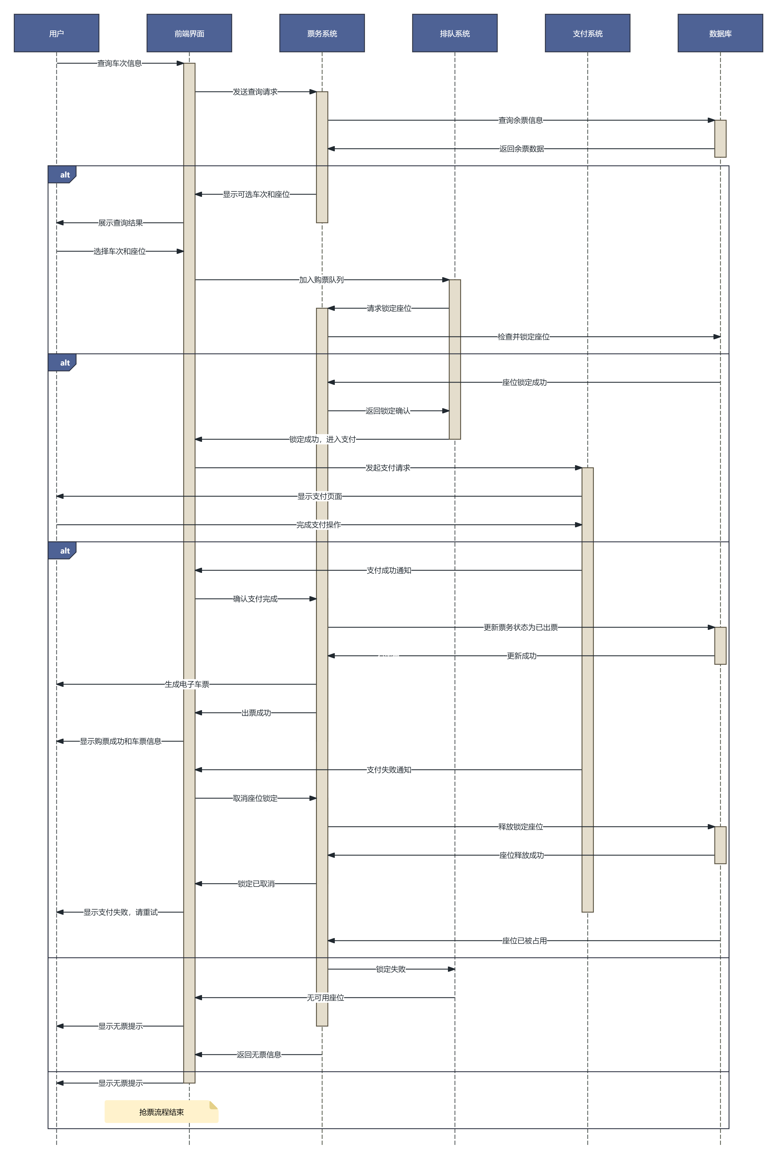 “生成一个抢火车票的时序图,包含用户、前端、票务系统、支付系统、数据库、排队系统,要体现查票、锁座、支付、出票的全流程,还要处理无票和支付失败的异常情况”