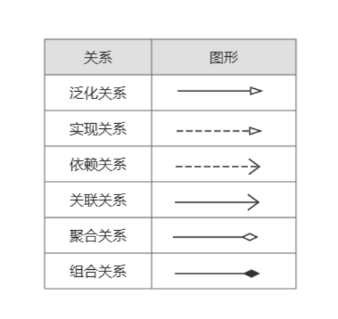 类与类之间通过不同的线条连接,每种线条代表一种关系。这六种关系是面向对象设计的核心: