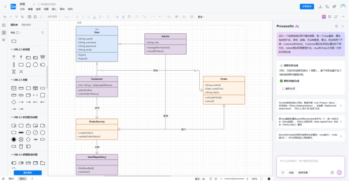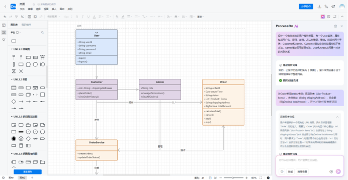 在软件开发的世界里,类图就像是建筑的施工蓝图。无论你是做系统设计、写技术文档,还是跟团队对齐架构思路,都绕不开它。类图是UML图中的一种,制作类图时需要遵循设计规范,传统的制作方式是使用UML图制作器,通过拖拽图形绘制类图,目前使用AI制作类图正在逐渐普及,今天就分享如何使用ProcessOn AI在十几秒内生成一张结构完整、关系准确的UML类图。