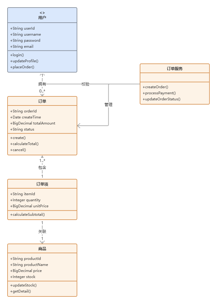 AI生成的类图会把这三个类的关系梳理得清清楚楚:User和Order之间用关联线连接,Order和Product之间通过OrderItem这个中间类实现多对多关系,属性和方法的可见性也自动标好。几分钟就能拿到一张可以直接用在设计文档里的专业类图。