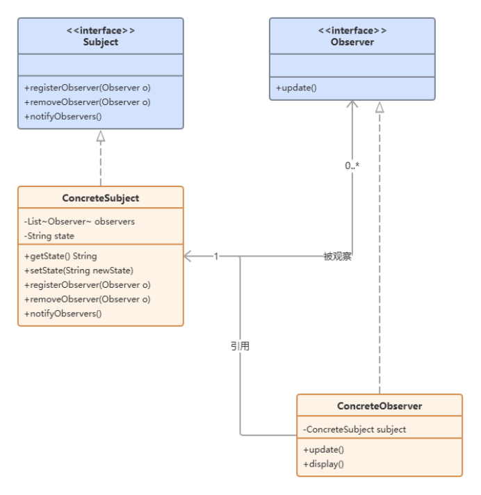 输入需求:“帮我生成观察者设计模式的类图。有一个Subject接口,包含注册、移除、通知观察者的方法。ConcreteSubject类实现这个接口,有一个状态属性和获取状态的方法。Observer接口有一个update方法。ConcreteObserver类实现Observer接口,持有对ConcreteSubject的引用,update方法里根据主题状态做出响应。”
