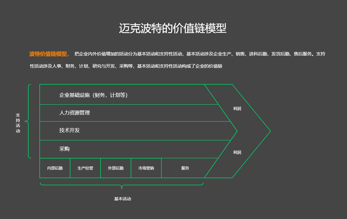 波特价值链模型将企业的经营活动分为两大类:基本活动和支持性活动。