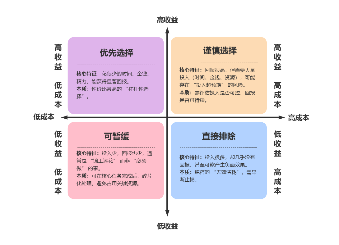 常用的分析工具是成本—价值矩阵。横轴是成本高低,纵轴是收益贡献高低,将活动放入四个象限: