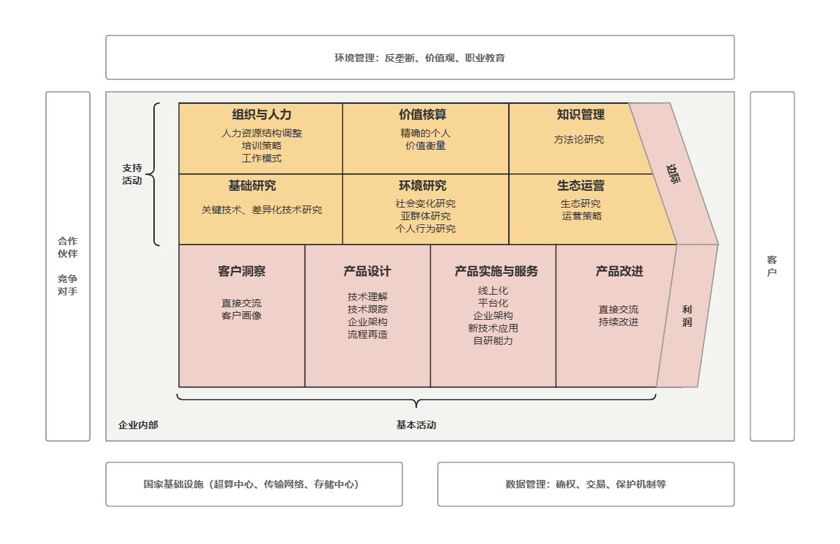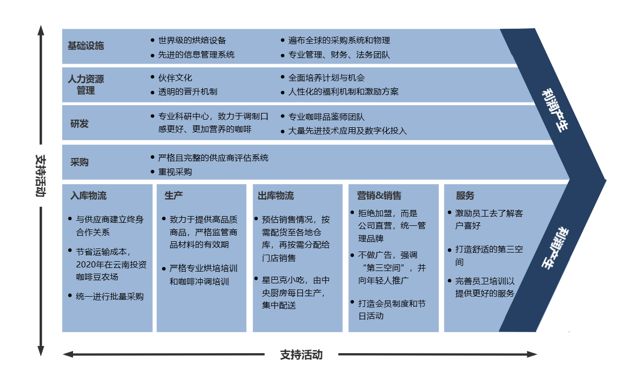 支持性活动:为基础活动提供基础设施和资源的活动。包括:采购、技术开发、人力资源管理、企业基础设施。