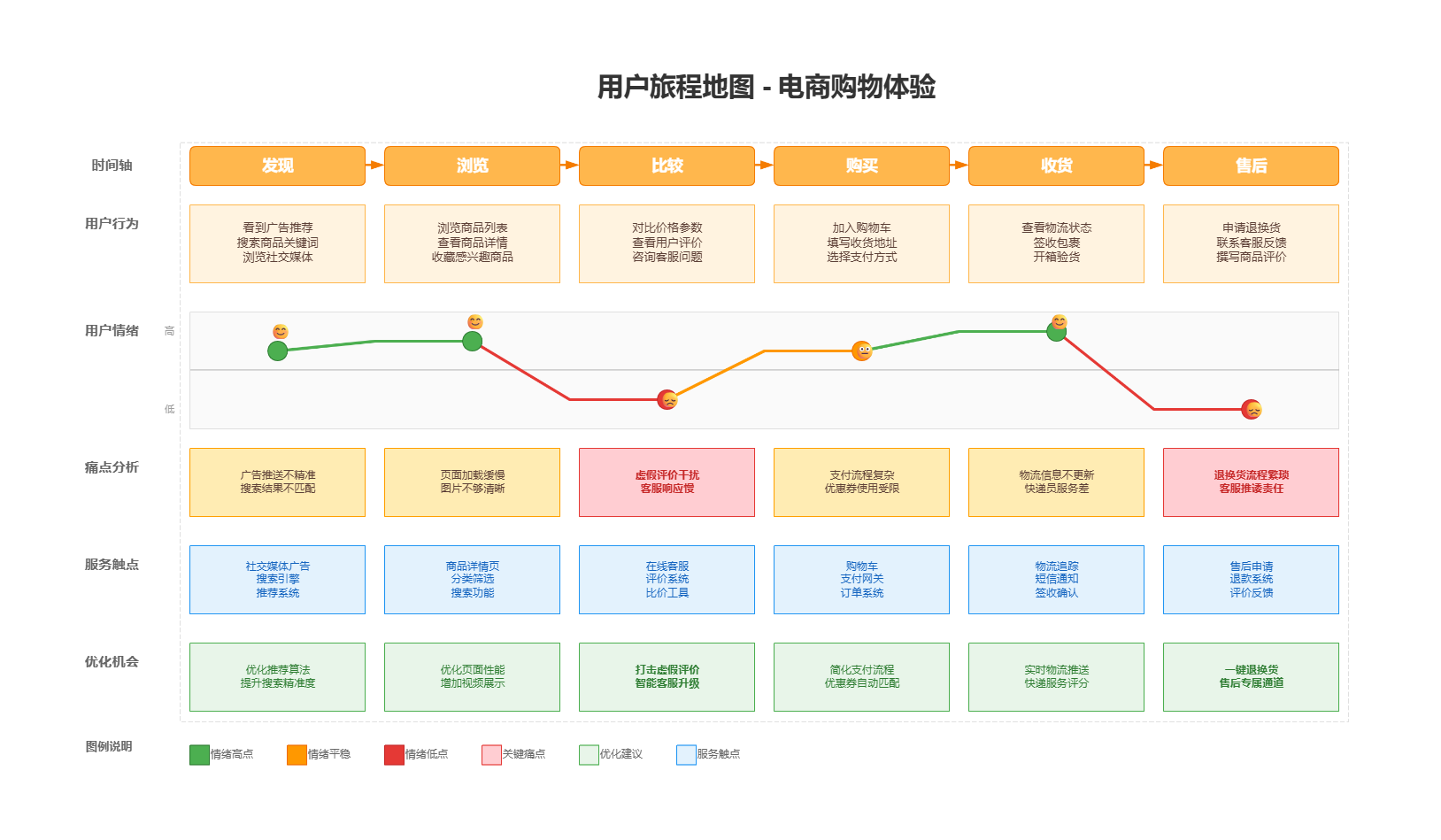 绘制方法:以电商App为例,将用户从打开App到完成下单的全流程分解为“搜索商品-浏览商品-比较商品-购买-收货-售后”等步骤。可以绘制出竞品和自家产品的用户旅程地图,然后比较竞品和我们的表现差异(如“竞品A在结算页有优惠券推荐,我们缺失”)。