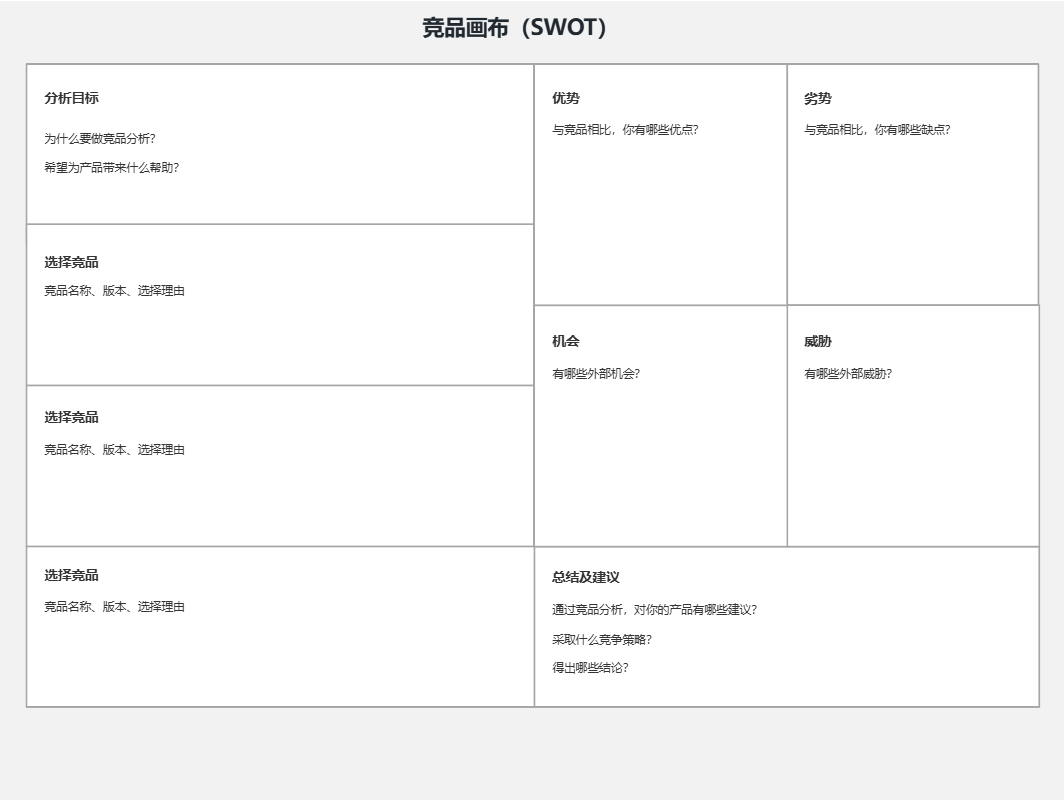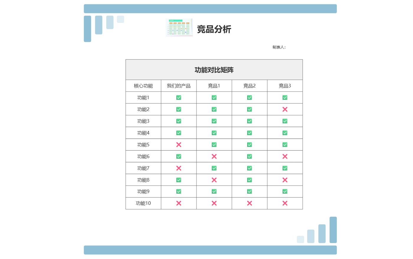 绘制方法:横轴列出竞品名称,纵轴列出功能点,用“√/X”等符号表示有无。还可以增加一行权重,标注每个功能对用户的重要程度。