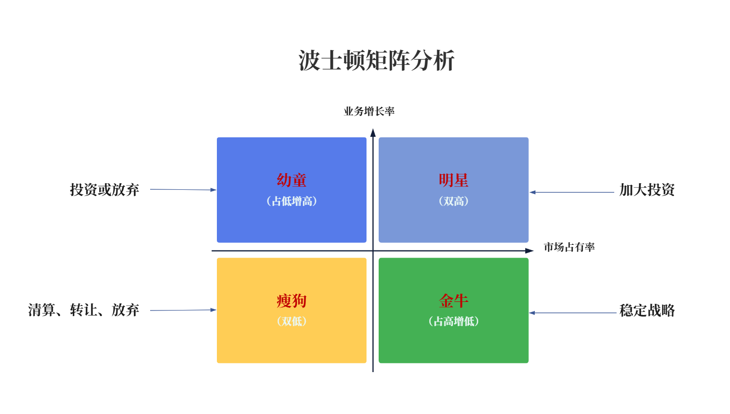绘制方法:横轴是“市场增长率”(或用户需求强度),纵轴是“业务增长率”(或我们的竞争优势)。将功能点、产品或竞品放入四个象限: