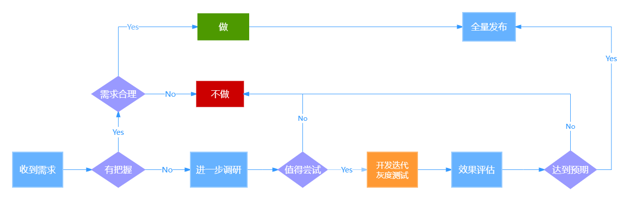 产品经理/项目经理在收到用户的需求时需要经过一系列的评估才能实现最终功能的上线,以下就是需求评估的决策流程图。