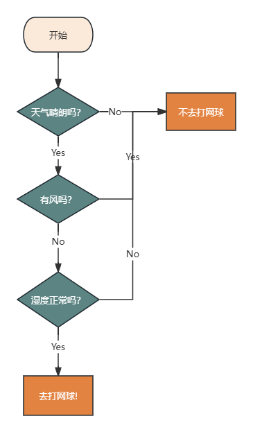 在生活中遇到问题时也可以使用决策流程图来帮助做决定,比如以下决策流程图可以帮助您判断今天的天气是否适合外出打网球。