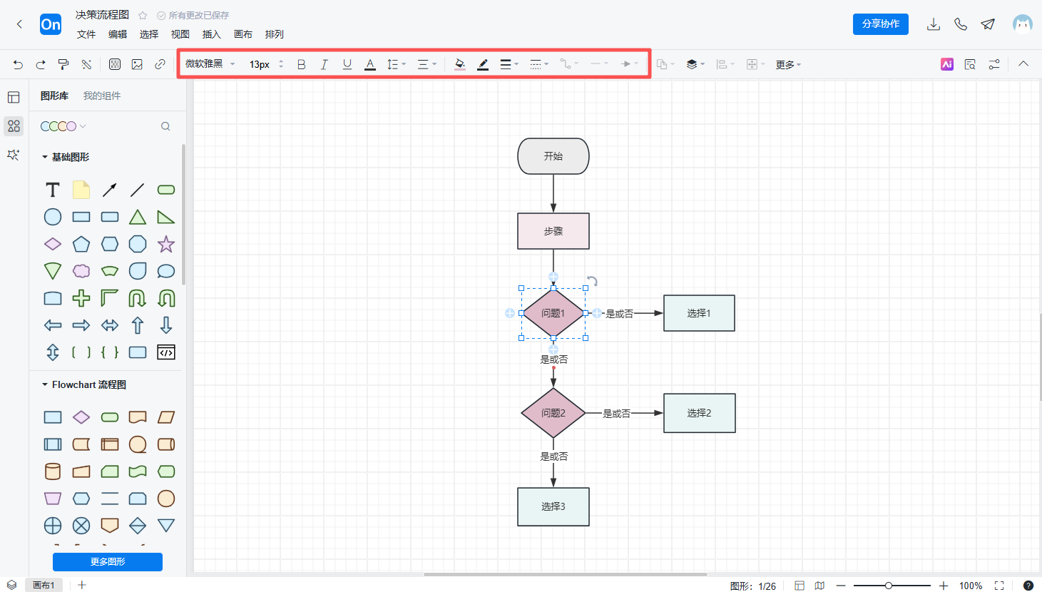 3. 选中图形或连线,顶部工具栏支持设置文本样式和连线样式,可以修改字体,字号,颜色,边框样式等。