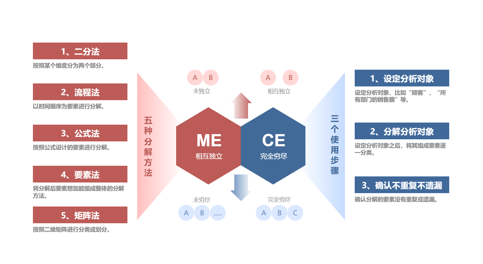 MECE原则(Mutually Exclusive, Cllectively Exhaustive)是麦肯锡战略分析的基石,意为“相互独立,完全穷尽”。这一原则要求在分析问题时,将问题拆解为若干个相互独立的子问题,同时确保所有子问题的集合能够完整覆盖原问题,没有遗漏。这种结构化的拆解方式,能够帮助分析者避免思维混乱,确保分析的全面性和逻辑性。比如在分析企业盈利能力时,可以按照收入、成本、费用三个维度进行拆解,每个维度下再进一步细分,确保没有遗漏任何影响盈利的因素。