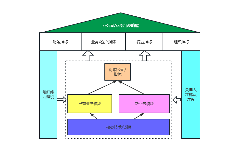 战略屋模型是麦肯锡用于将战略可视化的重要工具,它以房屋的结构形象地展示了企业战略的各个组成部分及其相互关系。屋顶代表企业的战略目标,通常包括财务指标、业务/客户指标、行业指标和组织指标四个维度;房屋的中间部分是战略的核心,包括灯塔公司/指标、已有业务模块和新业务模块,这些模块是实现战略目标的核心载体;而房屋的地基则是核心技术/资源、组织能力建设和关键人才梯队建设,它们为业务模块的发展提供支撑。