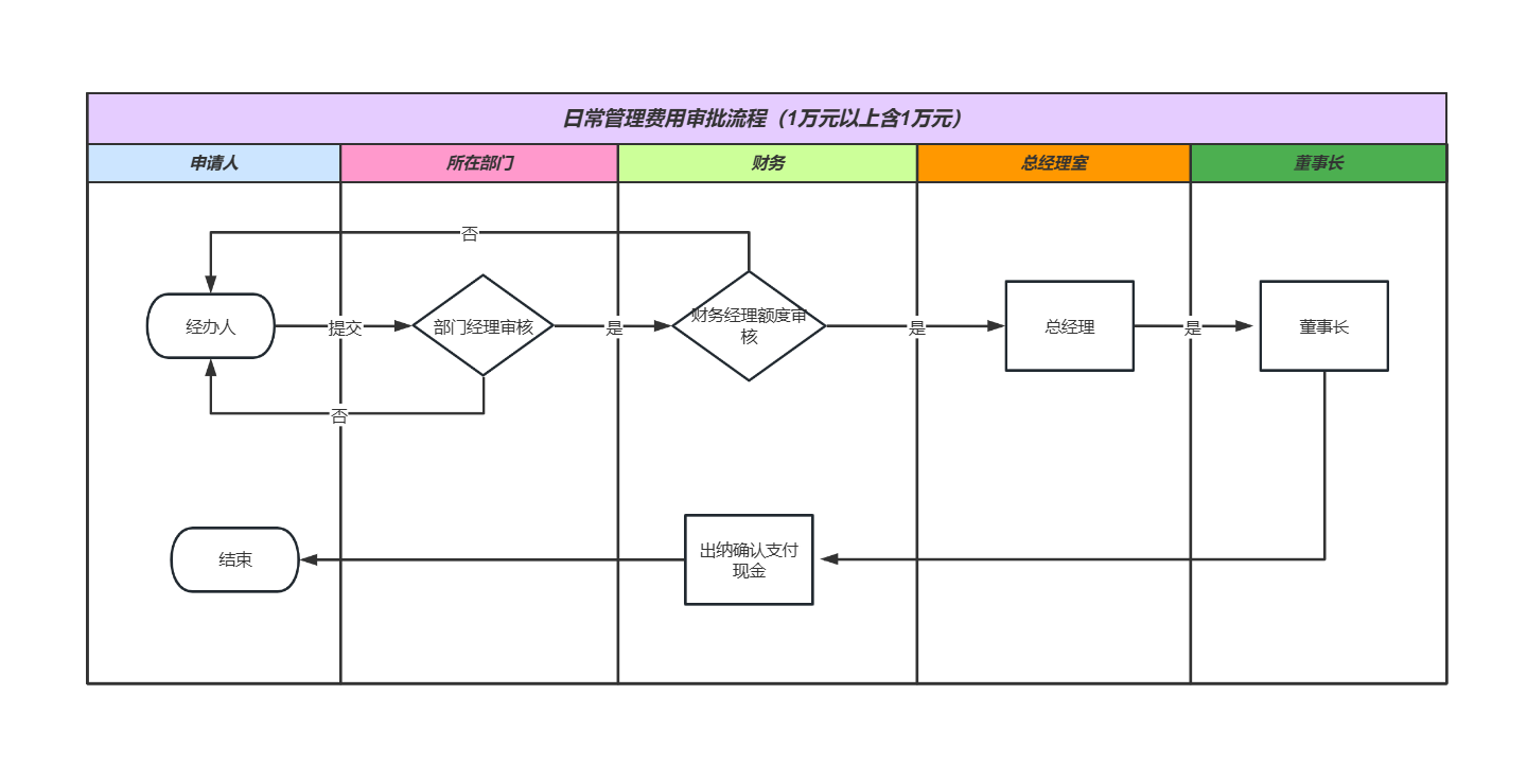 下面的费用审批流程就是一个典型案例,该流程按照申请部门、财务部、战略发展事业部、董事会四个部门划分,明确了每个环节的审批权限和责任。从申请人提交申请,到部门负责人审核,再到财务部的费用专员、财务经理审核,最后到战略发展事业部的副总裁、总裁审批,重大事项还需董事会董事长审批。这种分层审批的机制,既确保了费用使用的合规性,又体现了战略导向——与核心战略相关的费用能够得到优先审批,而与战略无关的费用则会受到严格控制。
