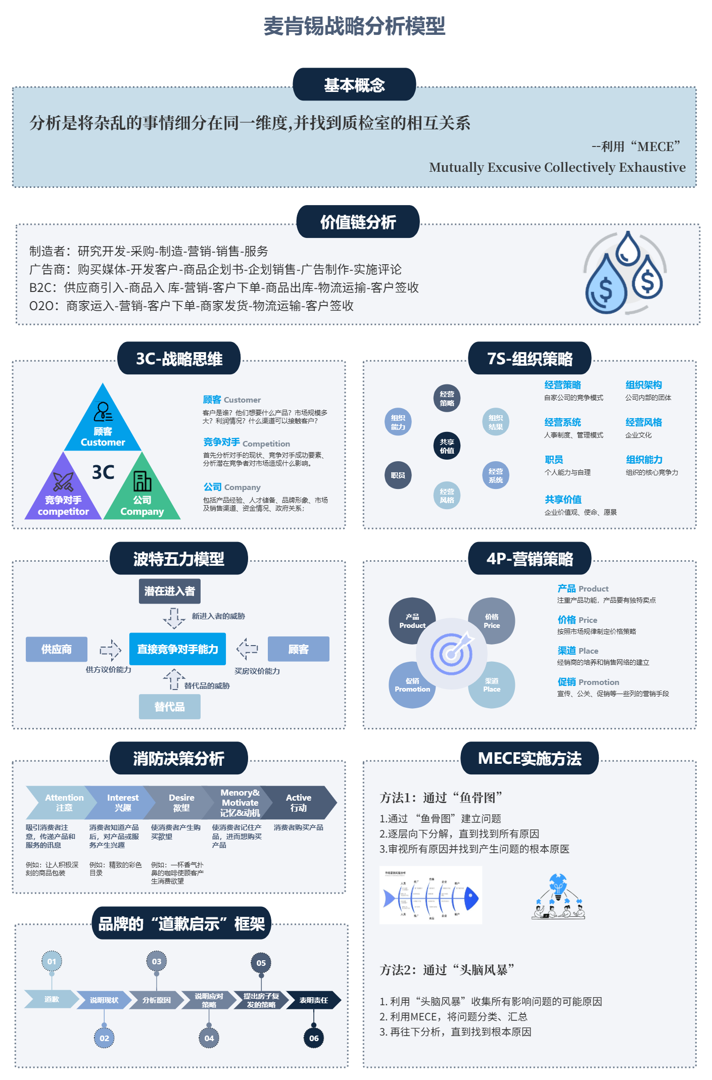 除了MECE原则,麦肯锡战略分析体系还包含多个经典工具,这些工具从不同角度切入,帮助企业完成战略分析的全流程。价值链分析帮助企业梳理从原材料采购到产品销售的全环节,识别核心价值创造点;3C战略思维模型从顾客、竞争对手、公司三个维度,构建企业的战略三角;波特五力模型则用于分析行业竞争格局,评估企业的市场地位;4P营销策略模型则聚焦于产品、价格、渠道、促销四个核心要素,指导企业制定营销战略。
