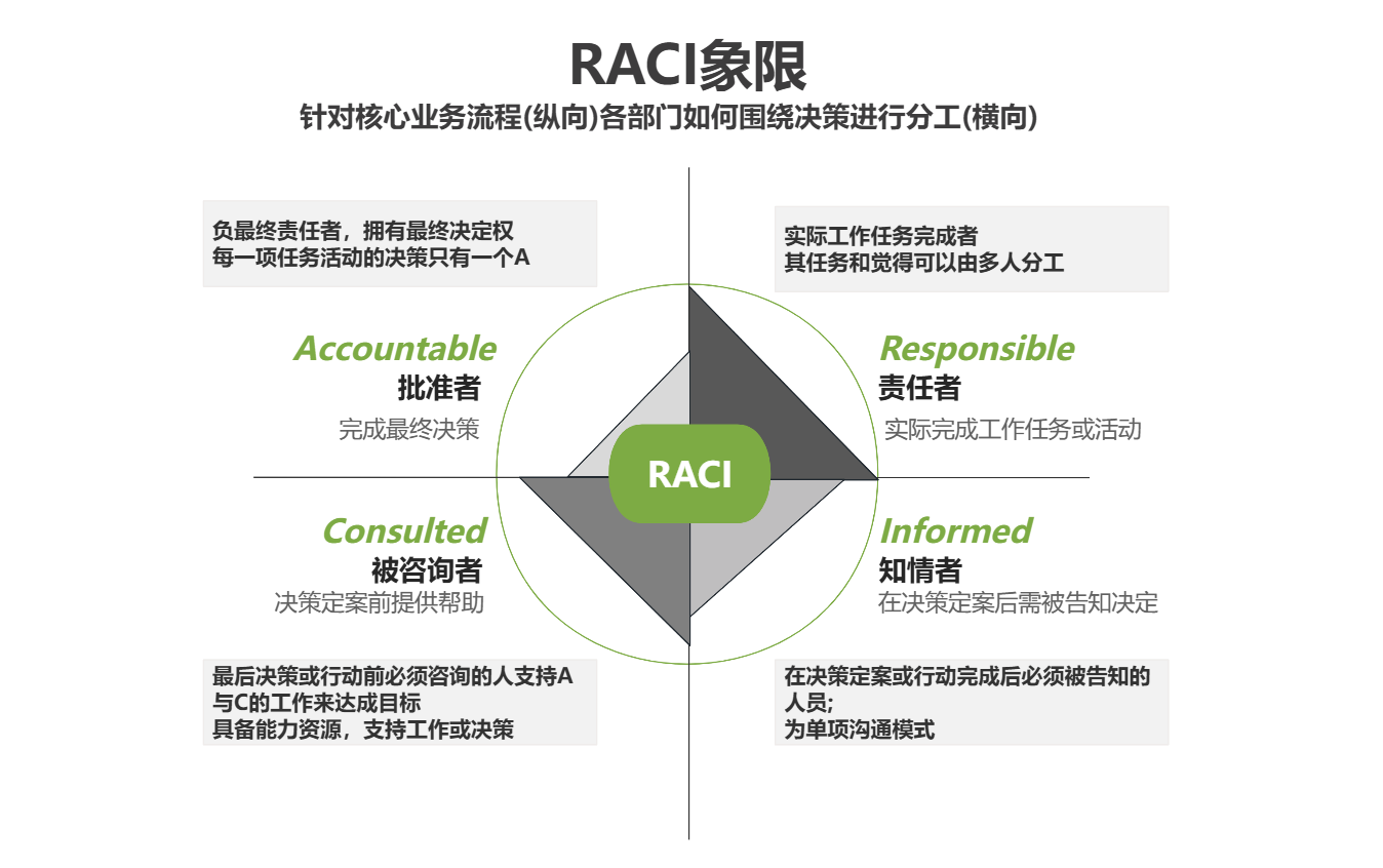 RACI模型是一个用于明确组织变革或项目管理过程中不同角色和相关责任的模型。它通过四个字母(R、A、C、I)来代表四种不同的责任类型: