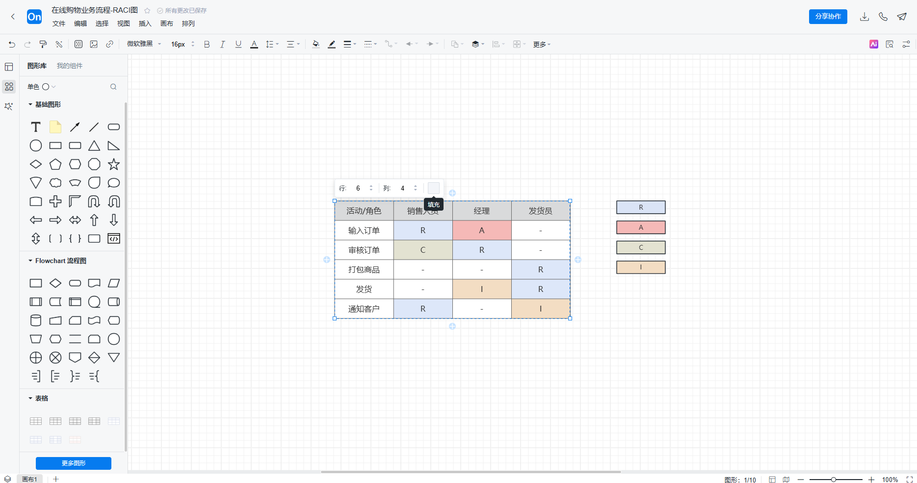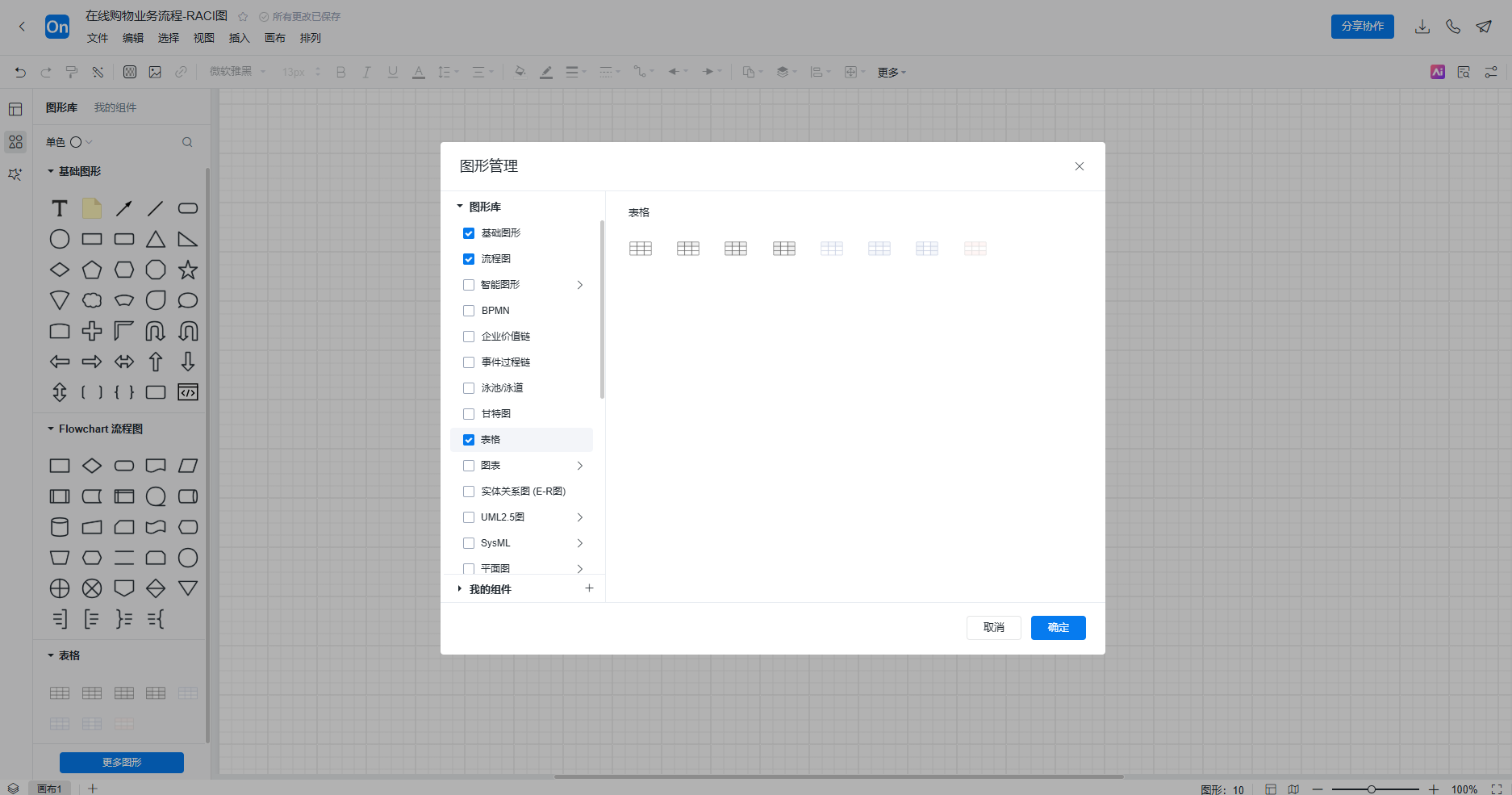 2. 从左侧图形库中拖拽出所需的符号,可以使用矩形构建RACI图框架,也可以点击左下更多图形,选择表格,使用表格制作RACI图。
