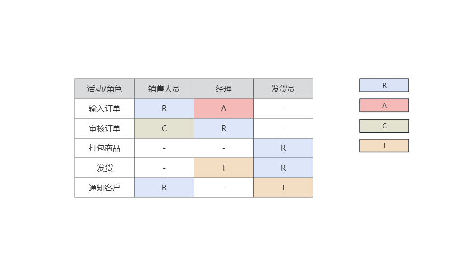 示例:假设我们有一个简单的在线购物业务流程,涉及三个角色:销售人员、经理和发货员。以下是该业务流程的RACI图示例: