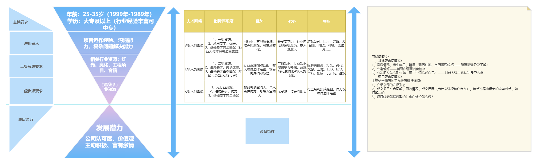 这个模板的左侧采用漏斗形结构,清晰地展示了从基础要求到核心能力的筛选过程。最上层的基础要求包括年龄、学历等基本条件,是人才筛选的第一道门槛;中间的通用要求和资源要求则进一步细化了岗位所需的经验和行业资源;最底层的发展潜力则关注人才的长期成长能力,体现了企业对人才的长远投资眼光。这种漏斗式的筛选逻辑,能够帮助企业逐步缩小人才范围,提高招聘效率。