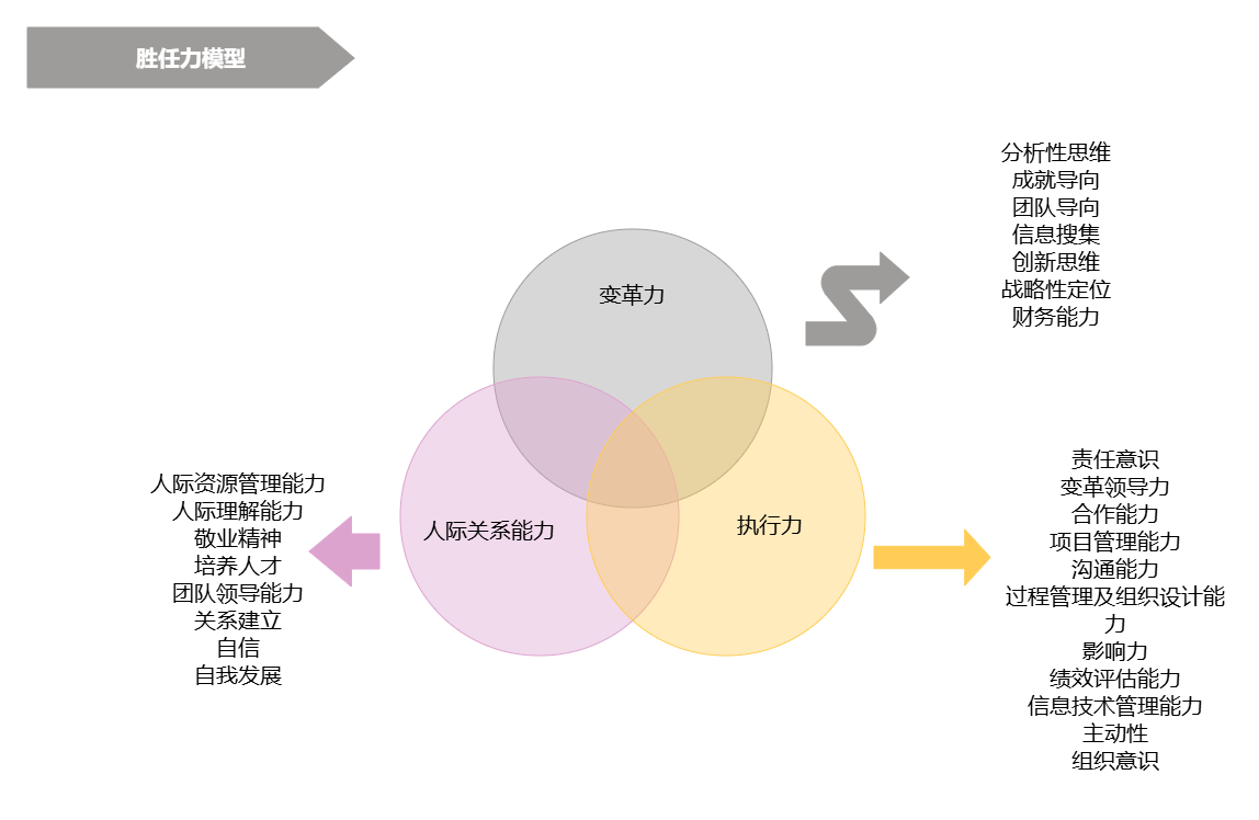 胜任力模型的核心是定义岗位所需的能力素质,一个科学的胜任力模型应该涵盖多个维度的能力,确保人才能够全面满足岗位需求。下图展示了胜任力模型的三个核心能力维度:变革力、人际关系能力和执行力,为我们构建全面的胜任力模型提供了清晰的框架。