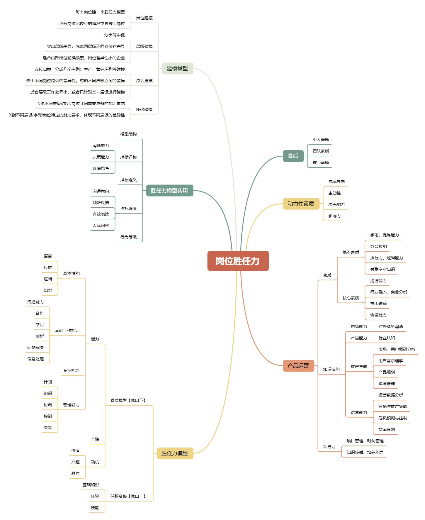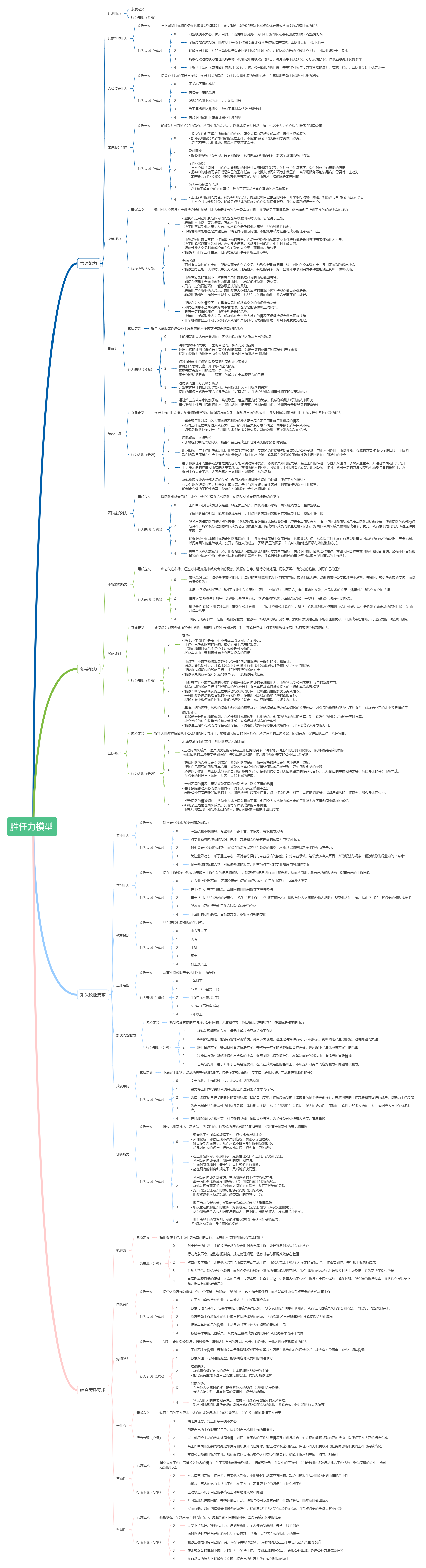 胜任力模型的价值在于能够指导实际工作,因此模型的内容需要具体、可操作。下面这个思维导图模板以“胜任力模型”为中心主题,分为管理能力、领导能力、知识技能要求、岗位素质要求四大分支,并对每个分支进行了详细的分级细化,为胜任力模型的落地提供了具体的指导。