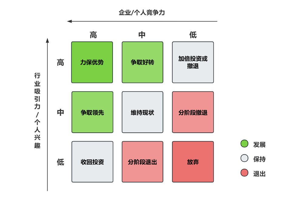 横轴是企业竞争能力(强/中/弱),纵轴是市场吸引力(高/中/低)。将每个细分市场放入九个格子中: