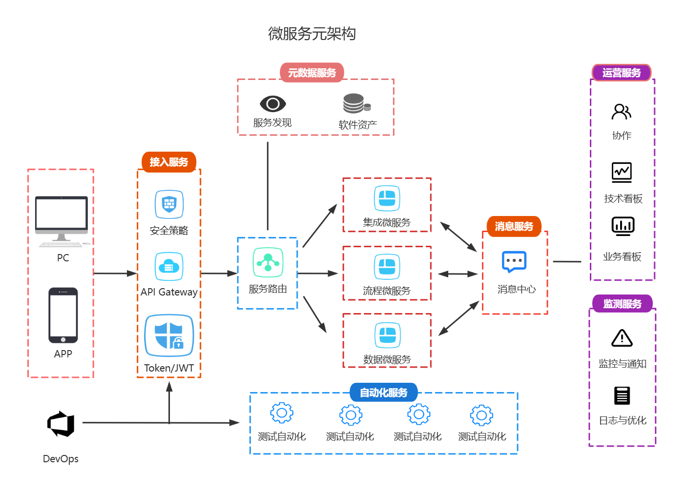 微服务架构图是应用程序的图形化表示,是架构图中的一种,展示了微服务系统中各个组件及其交互关系。这些组件通常包括多个相互独立和独立部署的松散绑定服务,它们通过明确定义的API进行通信。微服务架构图通过可视化的方式,帮助开发者理解系统结构、服务依赖关系和通信方式,从而更好地设计和管理微服务系统。