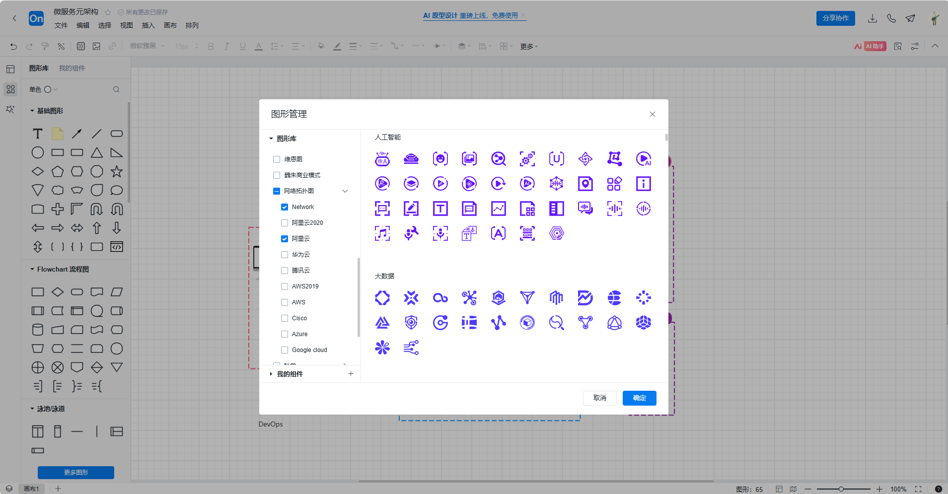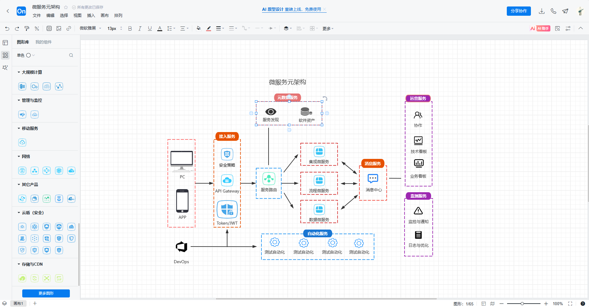 添加服务组件:点击左侧符号库下方的更多图形,可以根据需求选择流程图,网络拓扑图等元素,然后将各个微服务组件添加到画布上。这些组件可能包括微服务、API网关、服务注册表、负载均衡器等。