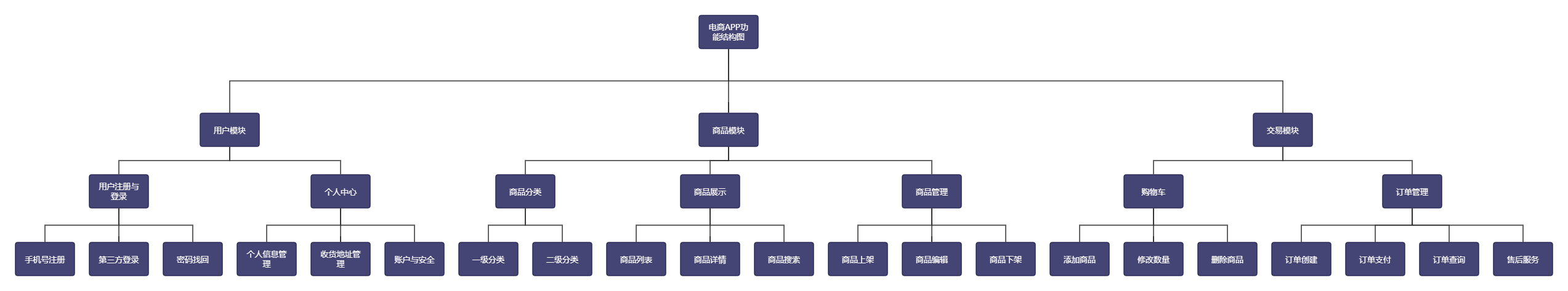 二级功能:每个一级模块下的核心功能(如“商品模块”下的“商品分类、商品展示、商品管理”)