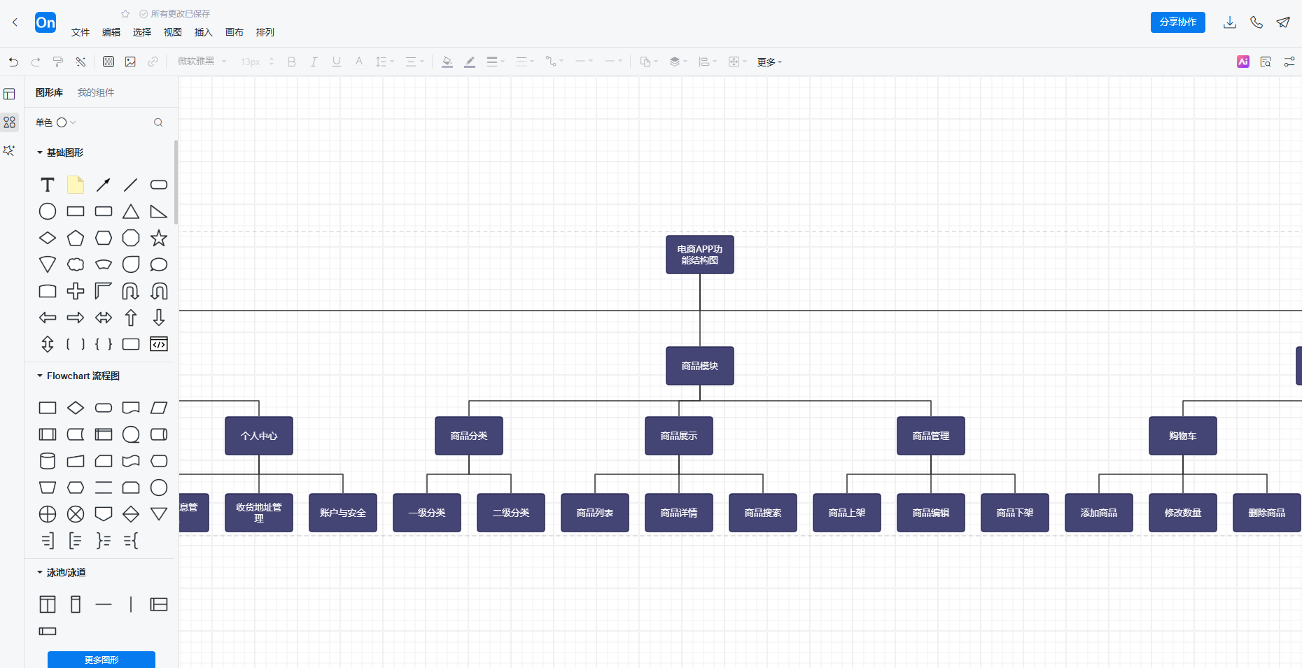 在ProcessOn中,可以直接用“流程图”或“组织结构图”模板来画功能结构图。