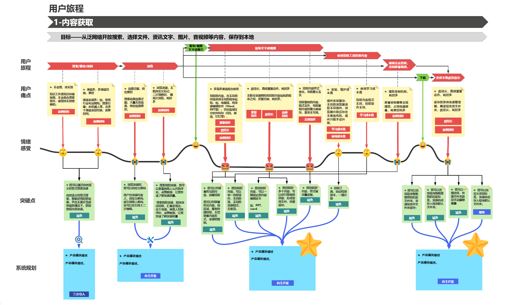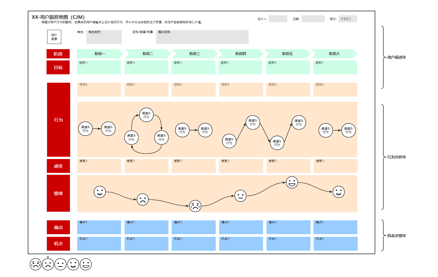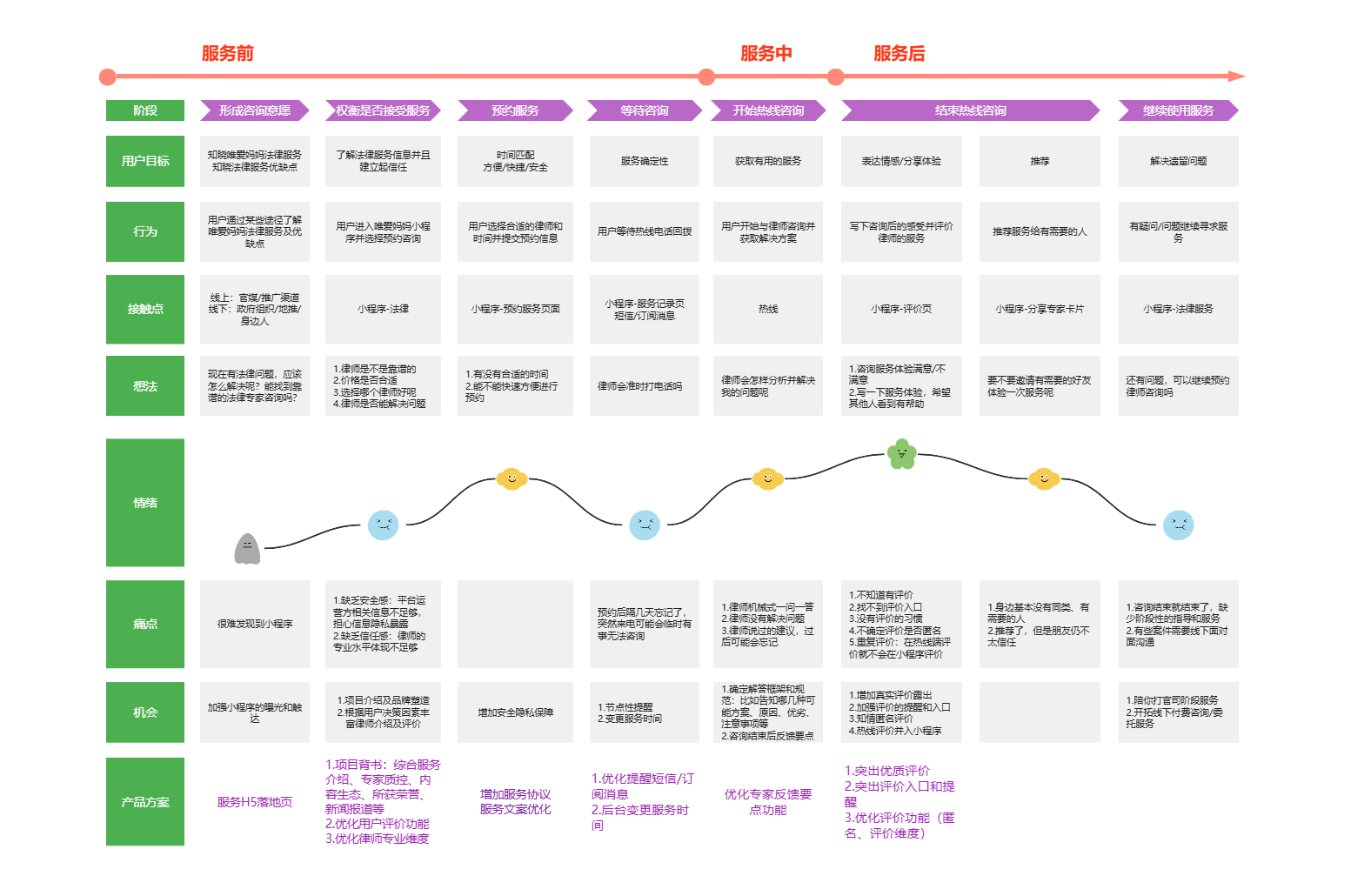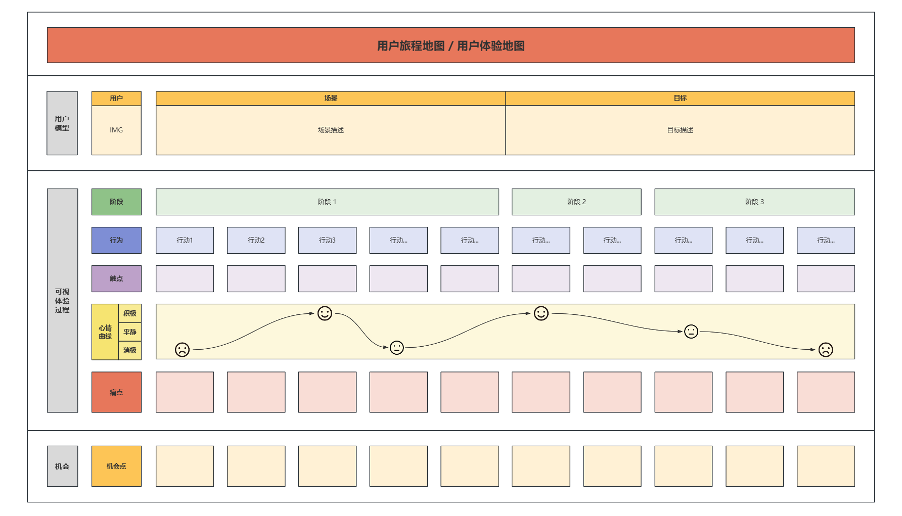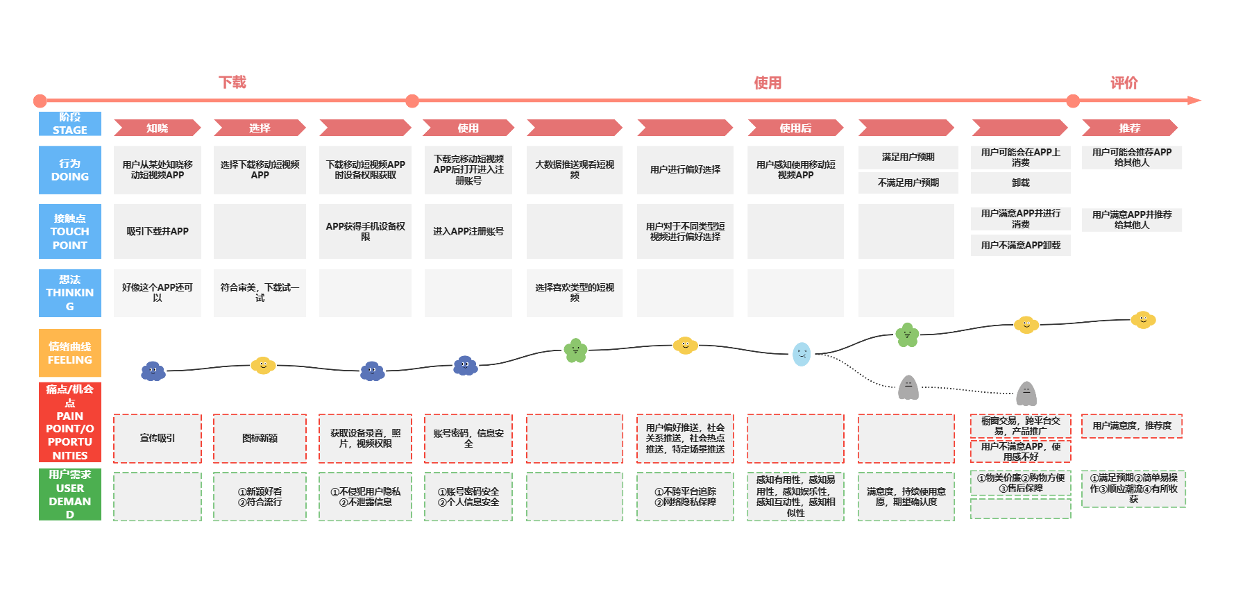 你可以把它理解为一张“用户体验地图”——横轴是时间,纵轴是用户的行动、想法和情绪。通过这张图,团队可以直观地看到:用户在什么时候、做了什么、想了什么、感受如何、遇到了什么问题。