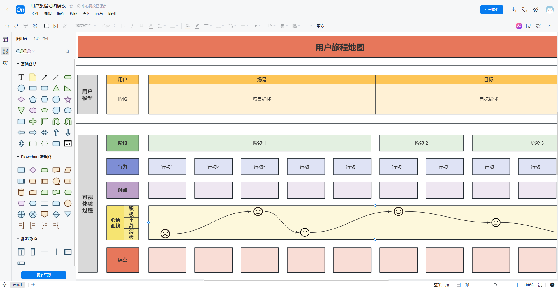 在ProcessOn中,我们提供了丰富的用户旅程图模板和AI辅助生成功能。你可以一键创建旅程图框架,快速添加用户角色、触点、情绪曲线等元素,并支持团队实时协作编辑。无论你是想梳理现有流程,还是规划全新体验,都能在这里找到高效的工具支持。
