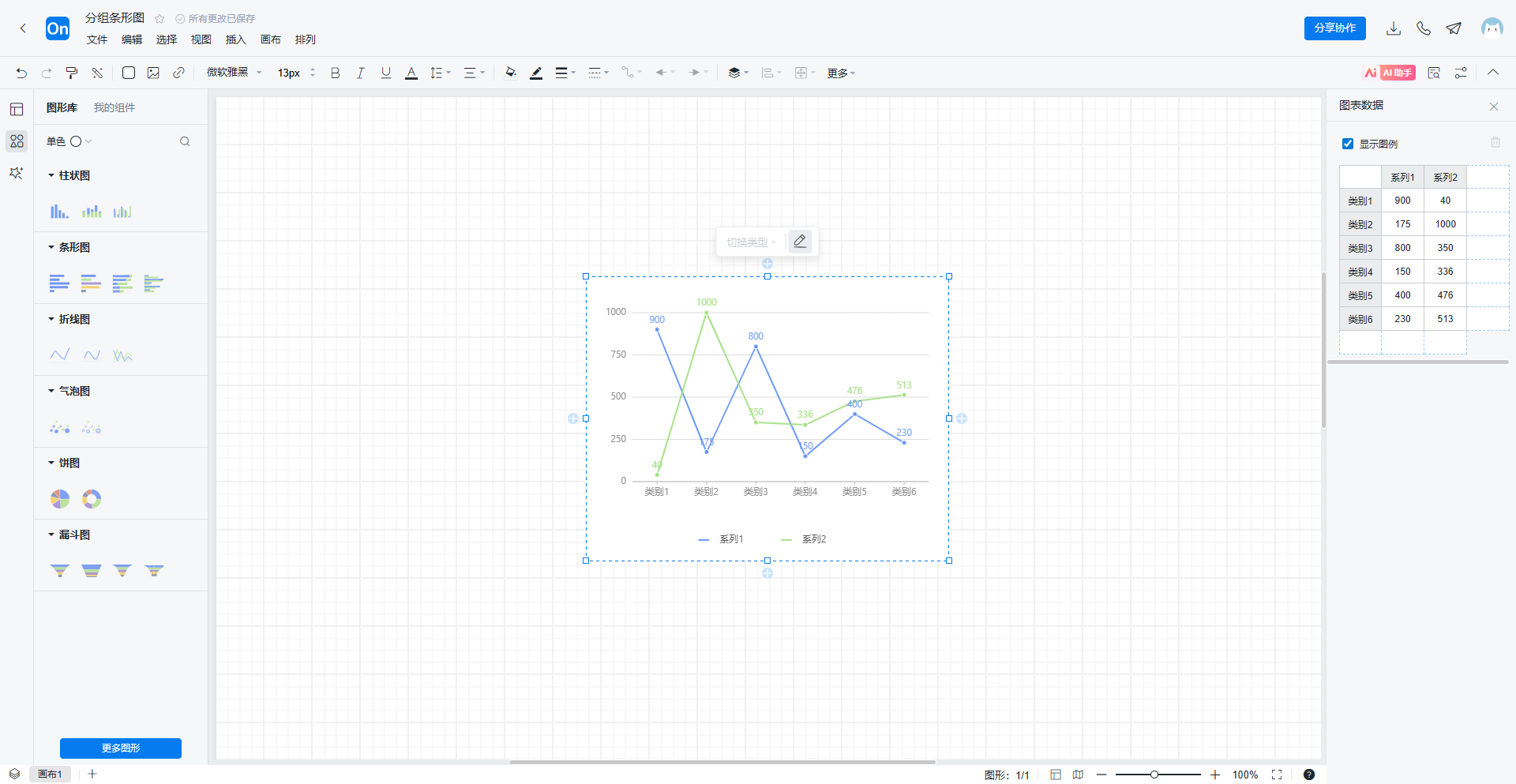 2. 点击左侧图形库下方更多图形,选择图表-折线图,将折线图拖拽到画布,点击工具栏编辑可以在右侧设置类别名称和具体数值。