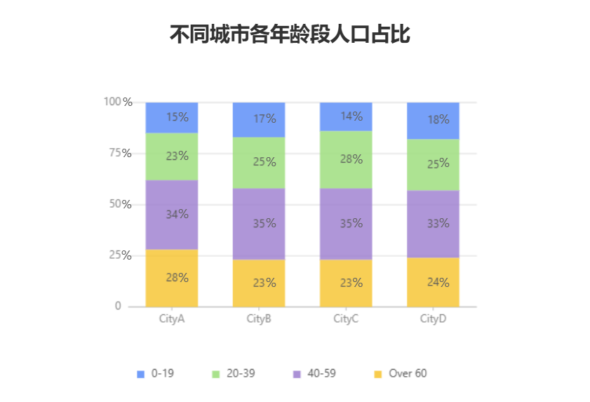 与堆叠柱状图类似,但每个柱子的高度始终为100%,各个系列矩形条的高度表示该系列在该分类中的数值占该分类总数值的百分比。重点在于展示各部分在整体中的比例关系,而不是绝对数值。比如,分析不同城市各年龄段人口数量占比,通过百分比堆叠柱状图可以直观地看出每个年龄段在不同城市的占比情况。