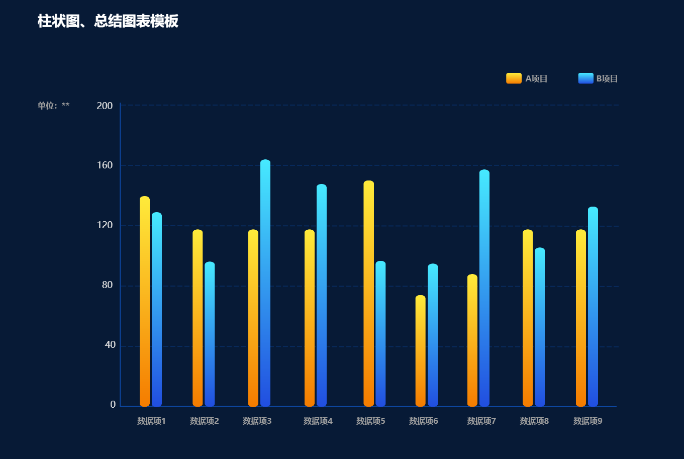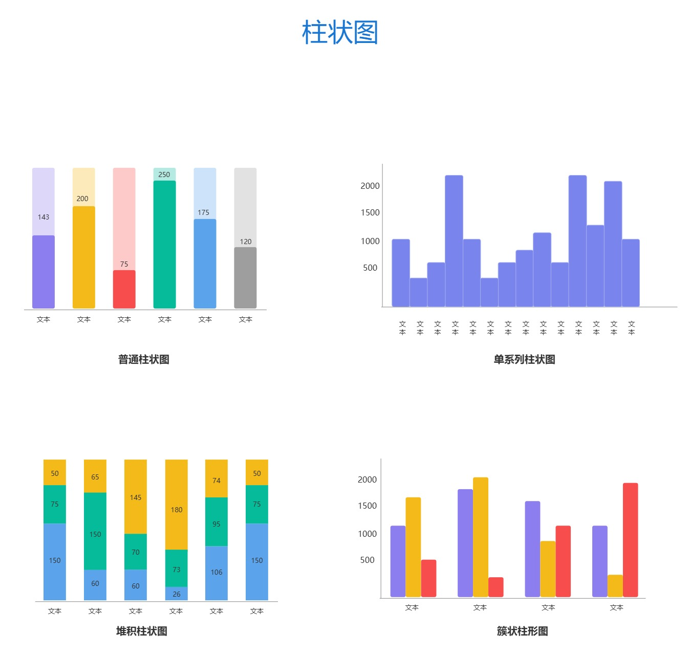 柱状图的基本形式,直条垂直排列,每个类别对应一个独立的条形,条形的长度或高度直接表示该类别的数值。适用于比较不同类别的单一数值,例如不同地区的销售额、不同产品的销量等。