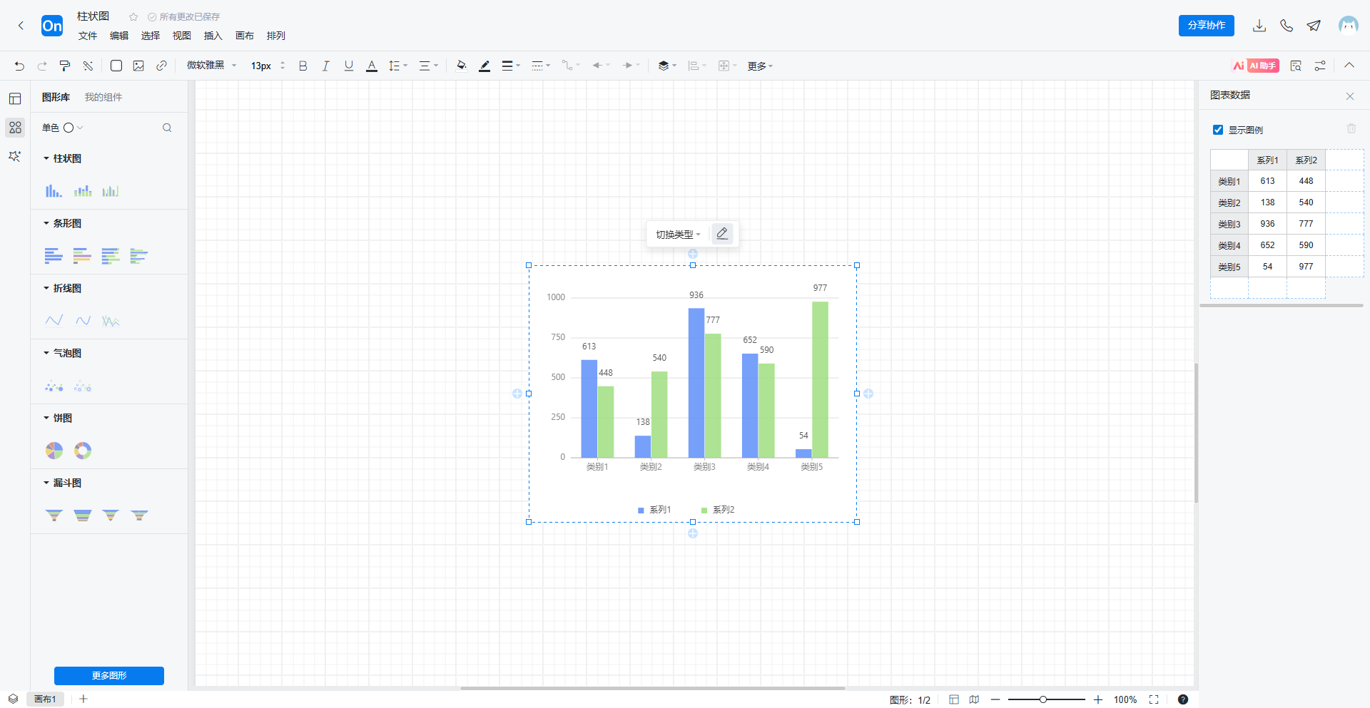 2. 点击左侧图形库下方更多图形,选择图表-柱状图,将柱状图拖拽到画布,上方工具栏可以切换柱状图类型,点击编辑可以在右侧设置类别名称和具体数值。